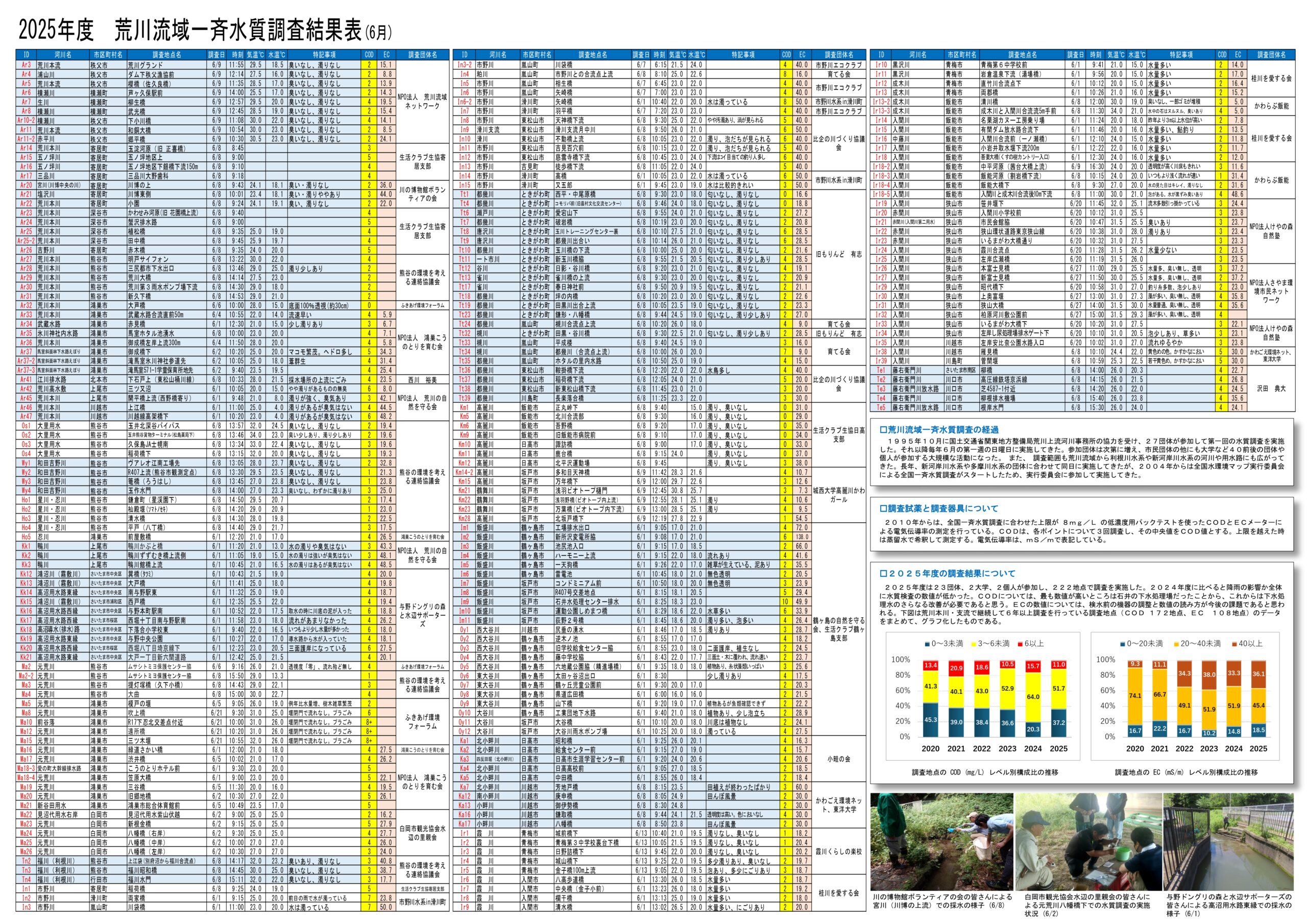 2025年6月8日に行われました荒川流域一斉水質調査の結果がまとまりましたのでホームページ上で公開させていただきます。今年は23団体、2大学、2個人の方々にご参加いただき、222地点の水質調査を行うことができました。ご協力いただきました団体・大学・個人の方々に感謝いたします。詳細は、以下のマップおよび結果表の画像をクリックしてご覧ください。